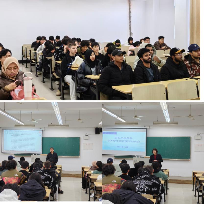 11月11日下午,国际交流学院召开2026届中外毕业生岗位实习动员会。会议由学工部主任卜忠君老师主持,学院领导班子、教科办主任等相关老师、2026届全体学生参加。